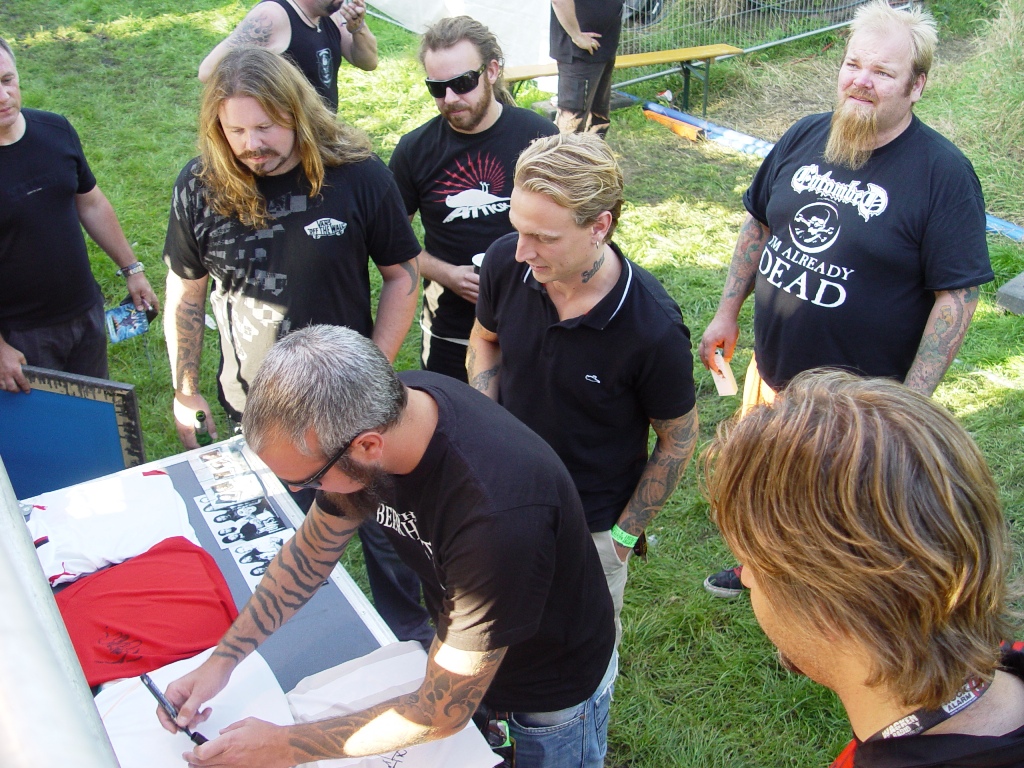 Die Jungs von In Flames waren sofort bereit, sich an unserer Aktion zu beteiligen und die mitgebrachten Trikots zu unterschreiben. Rassismus ist ein Thema, das uns alle angeht. Darüber waren wir uns mit der Band nach unserem leider aus Termingründen nur sehr kurzen Gespräch einig. Unsere Aktion finden die bekennenden Fussball-Fans übrigens klasse.Weitere Informationen über In Flames: