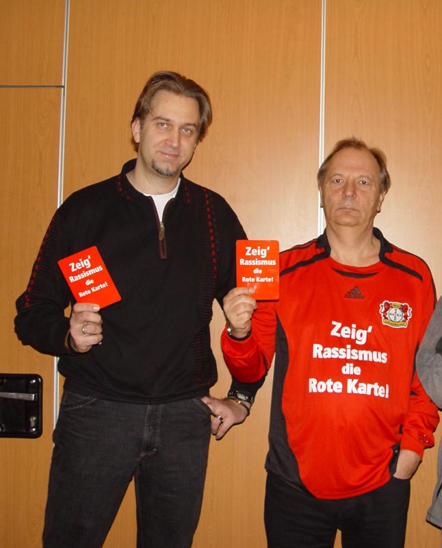 Ohne zu zögern griff sich der bekannte Kaberettist das Trikot von Bayer 04 Leverkusen und streifte es über. Das er bei unserer Aktion mitmache sei doch klar; nahm die Rote Karte und hielt sie in unsere Kamera. Dafür unseren herzlichen Dank, Herr Schmickler.